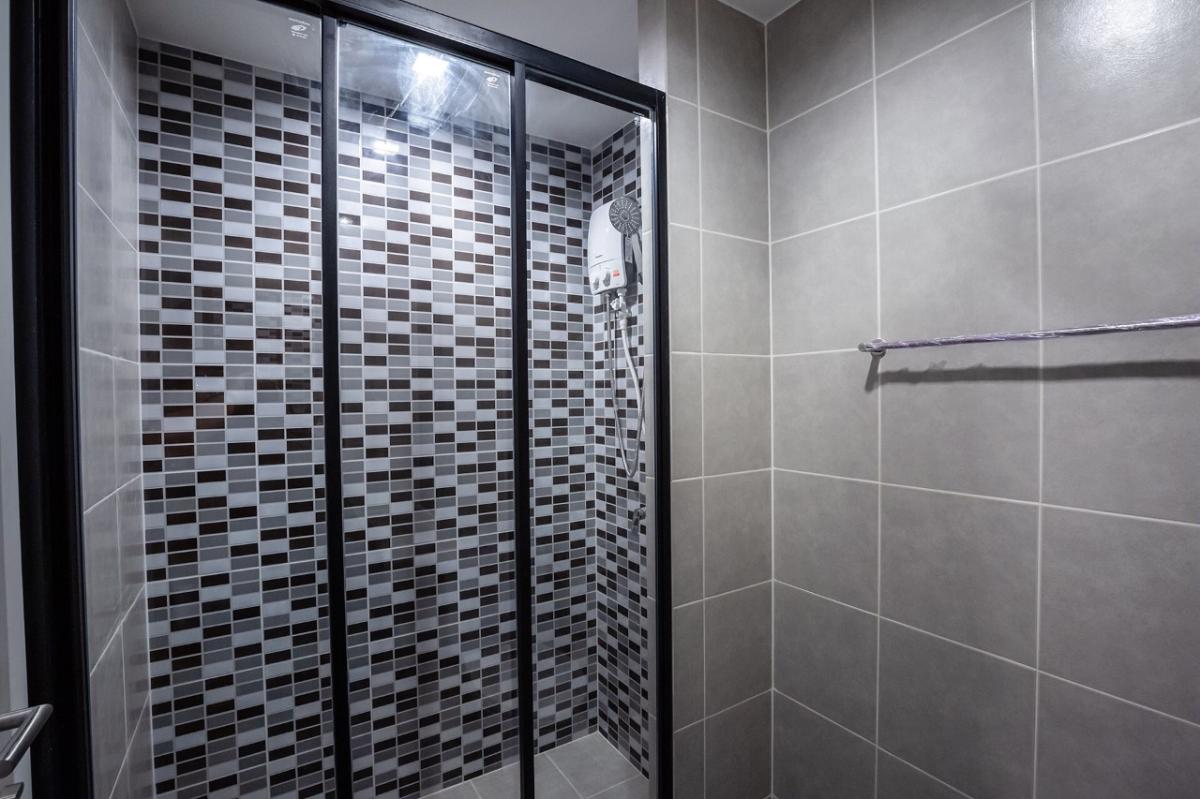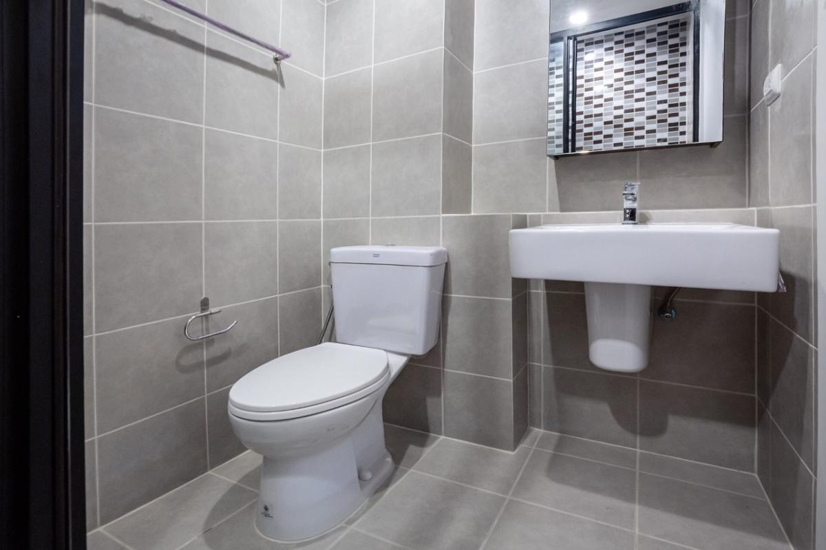 - สุขภัณฑ์ในห้องน้ำ กระจกฉากอาบน้ำ พร้อมตู้เก็บของใต้เคาร์เตอร์ และตู้ลอย